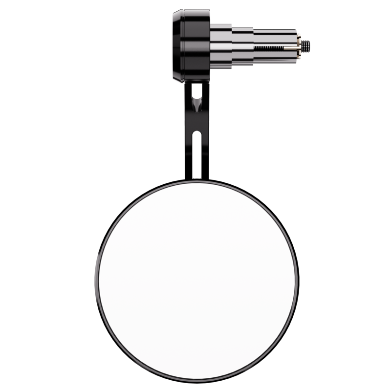 CNC-milled handlebar end mirror with a round head made of black anodized aluminum. Combined with polished bevels, this model stands for a noble, stylish design. Suitable for handlebars with an inner diameter of 12 to 22 mm. So for most 7/8 inch and 1 inch aluminum, or steel handlebars. Ideal vision through a curved glass with a slight tint. The mirror can be used on the left and right.