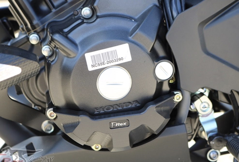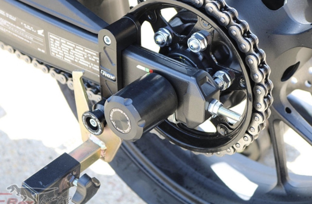 Lifting the rear of the CB300R can be challenging because the swing arms have no threaded holes for spools and are at an angle. Without spools, the bike can be difficult to lift with a stand. Once lifted, it can be unstable. The angle on the swing arms makes it worse. It can cause the bike to slip off the stand and fall. T-Rex spool adapters are made to meet this challenge. They are designed to securely attach to the swing arms and allow safely lifting of the rear wheel using a paddock stand. The aluminum brackets are lined with UHMW-PE (ultra-high molecular weight polyethylene), a tough plastic with good strength and wear resistance. This plastic keeps the aluminum brackets from scratching the swing arms.