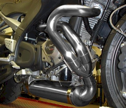 Twin Motorcycles, is very proud that Fanatics asked us because of our experience with Fuel mapping Buellâ_Ts, to test there new Exhaust. We where very proud with the results. Until now we tested almost every brand of exhaust and this one has the most power on lower RPM, and the most power on low and high RPM. Fanatics put a lot of money in the R&D for this exhaust and the results are great. All the results are SAE corrected. We have 94,7 Horse Power and 109 NM of torque on the rear wheel. THIS IS WITHOUT the 50MM headers. As soon as we have the dynoresults we post them here. If you would ask us what the best exhaust is we tested on the dyno it's absolutely the Blaster V. PLEASE WHEN YOU PLACE YOUR ORDER MENTION WICH TYPE OF EXHAUST YOU LIKE: Blaster v brushed, with engine spoiler mounting plates Blaster v brushed, without engine spoiler mounting plates Blaster v polishes, with engine spoiler mounting plates Blaster v polishes, without engine spoiler mounting plates