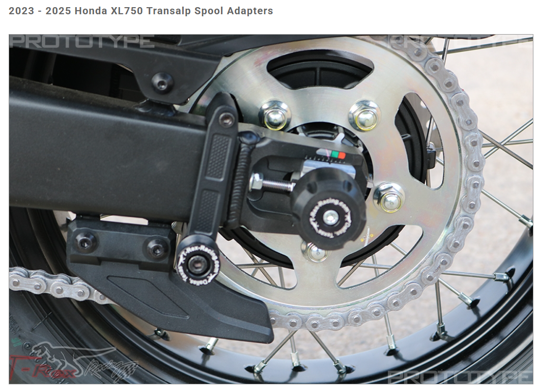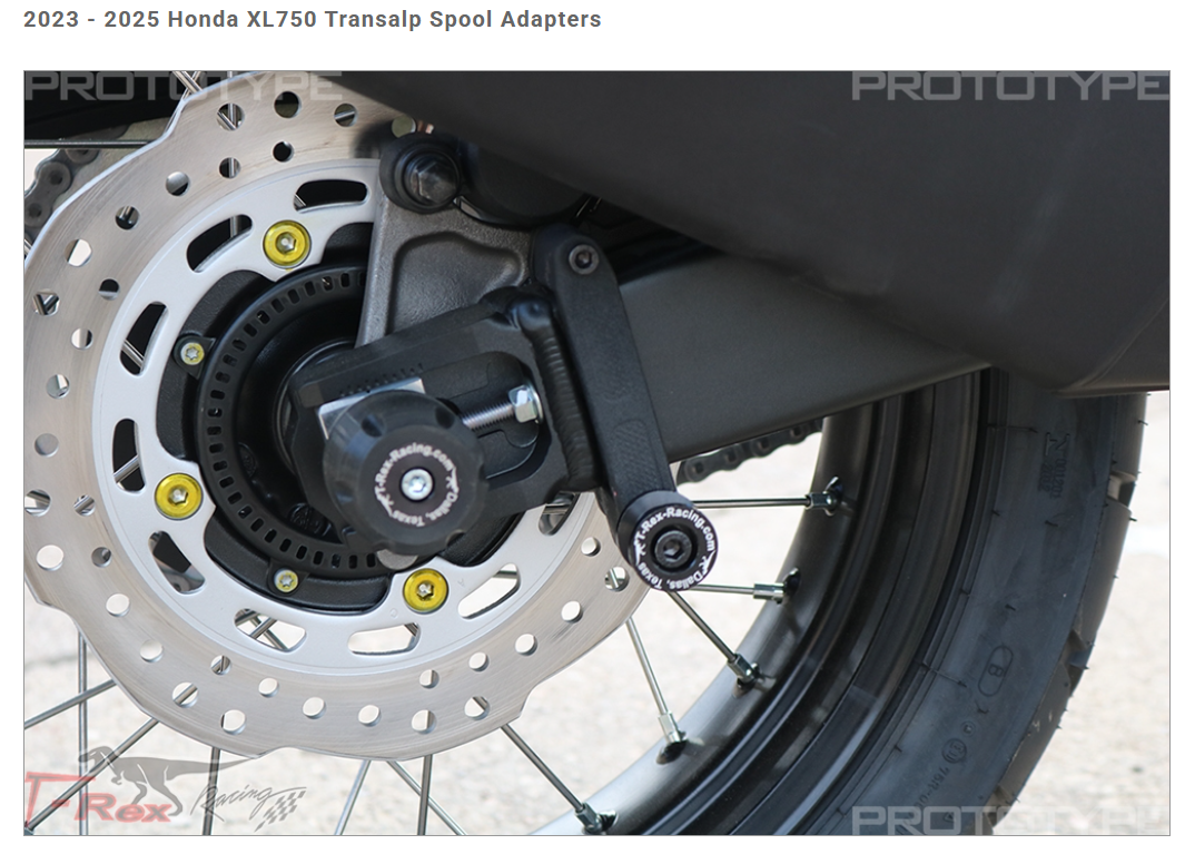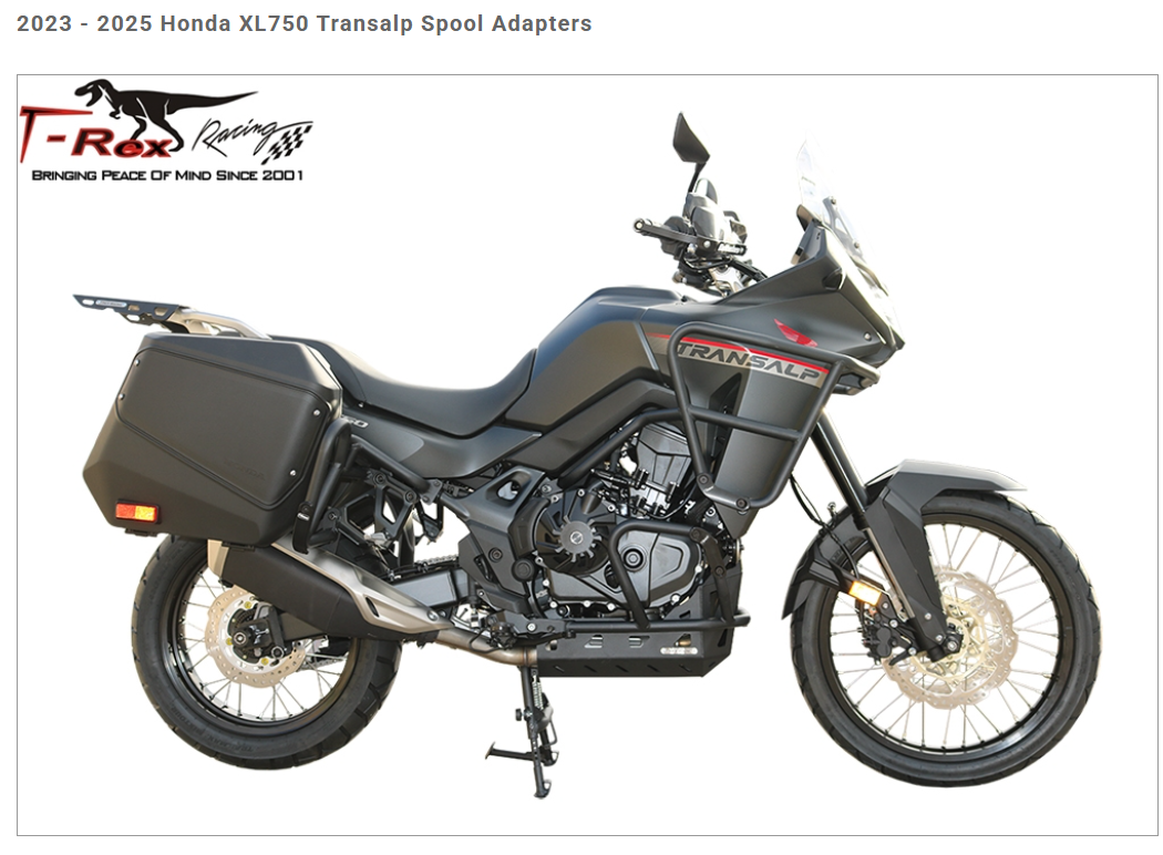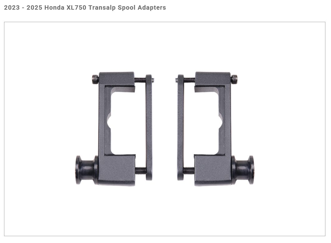 This purchase is for a pair of spool adapters for the models above. Lifting the rear of the XL750 can be challenging because the swing-arms have no threaded holes for spools and are at an angle. Without spools, the bike can be difficult to lift with a stand. Once lifted, it can be unstable. The angle on the swing-arms makes it worse. It can cause the bike to slip off the stand and fall. T-Rex spool adapters are made to meet this challenge. They are designed to securely attach to the swing-arms and allow safely lifting of the rear wheel using a paddock stand. The aluminum brackets are lined with UHMW-PE (ultra high molecular weight polyethylene), a tough plastic with good strength and wear resistance. This plastic keeps the aluminum brackets from scratching the swing-arms. The spools are made of aircraft grade aluminum. The adapters come in black only.