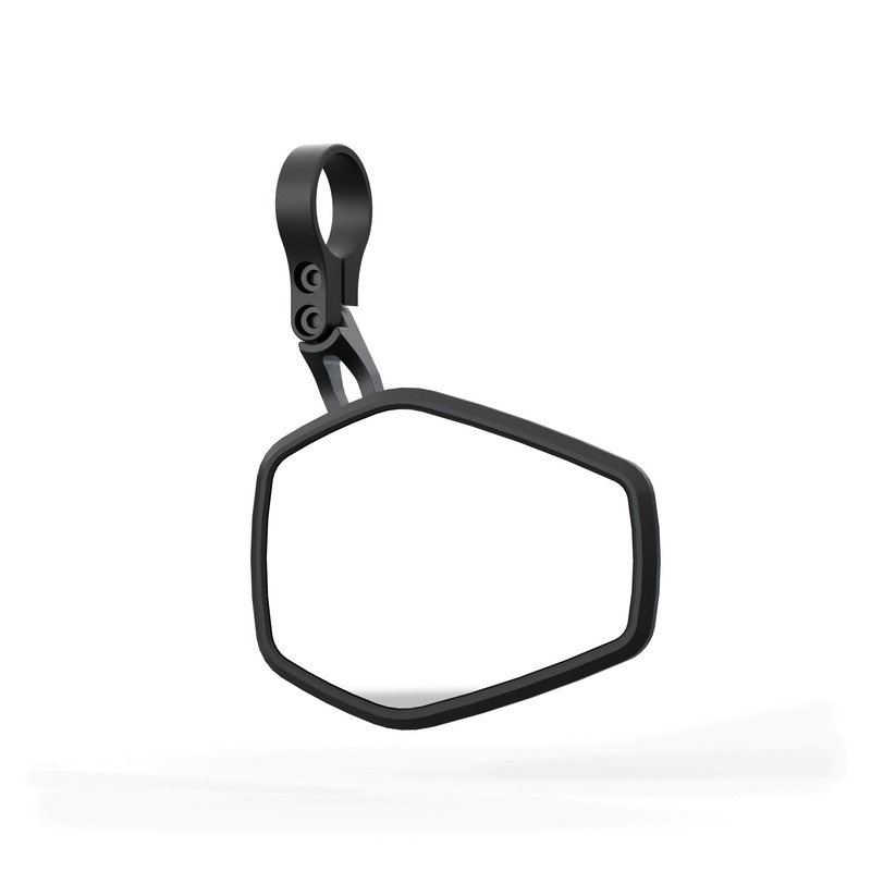 Rising and flat trapezoids create the futuristic design of the HIGHSIDER pro ESAGANO-RS mirror series, which thus picks up the design language of modern motorcycles. The base body of the mirror head, made of high-quality plastic, encloses the distinctive inlay, which is CNC machined from aluminum. This symbolizes the design language of the ESAGANO product family and creates a unique recognition value with the rising and flat tapered geometries. The bead-blasted and matte black anodized surface of the aluminum contrasts with the surface of the mirror head, completing the image. The aluminum short handlebar end stem allows the alignment of the mirror head in the appropriate position for your machine via its versatile adjustment range and can be mounted both standing and hanging on the handlebar. The mirror is mounted using the optically matching handlebar weight ESAGANO-LS with 12mm stem mount or a handlebar weight in an alternative design from our product range. If there is sufficient space, the mirror can also be mounted directly on the handlebar using the supplied aluminum adapter rings.