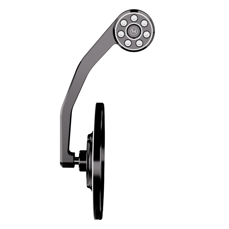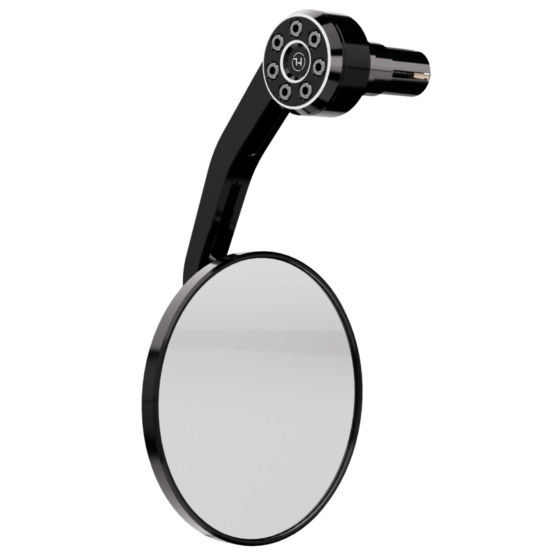 CNC-milled handlebar end mirror with a round head made of black anodized aluminum. Combined with polished bevels, this model stands for a noble, stylish design. Suitable for handlebars with an inner diameter of 12 to 22 mm. So for most 7/8 inch and 1 inch aluminum, or steel handlebars. Ideal vision through a curved glass with a slight tint. The mirror can be used on the left and right.