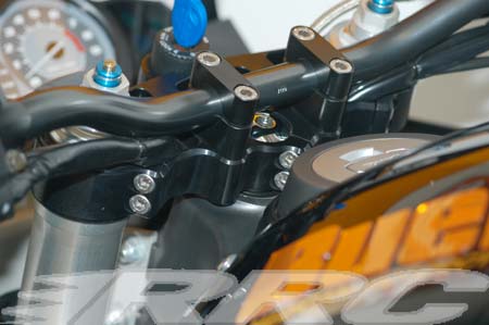 The CNC produced, black-plated aluminium fork with double-clamping screws allows the mounting of an 800 mm wide Superbike handle bar onto all XB -R models. Therefore it is not necessary to remove or modify the original covering. The modification provides a completely new feel, with improved handling, to the driver.Complete kit consists of:CNC produced fork with double clamping screws and, weight reducing - milled bags on the top and bottom.Aluminium fork-clamps Screws and Installation parts to fix the ignition lock. Steel covered brake line, coated with transparent heat shrink wrap. All necessary mounting screws made of high-grade steel included with the detailed mounting instructions. Handle bar can max. 800 mm wide