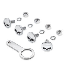 Leave them looking at your "attitude". This complete license plate hardware kit features chrome-plated skull-shaped bolts with sinister black-filled eyes. The hardware is installed with a special open wrench to reduce the possibility of license plate theft. Kit includes four skull bolts, nuts, lock washers and the special wrench.