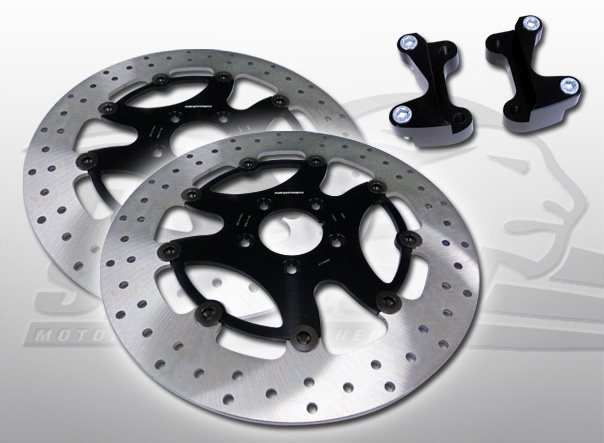 Kit includes two billet adapters anodized blacks, to reposition the original Calipers and two discs last geneneration by 320mm front brake disc