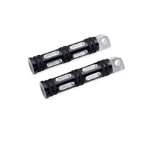Live your life on the edge. The Edge Cut Collection features a crisp anodized finish that is machined to expose the highlights of raw aluminum. The contrasting cut back look makes a powerful visual statement, and works great with both traditional and contemporary customizing styles. The slim Footpeg design allows a comfortable pivot point, and the wide surface and narrow rubber bands hold your boot firmly in place.