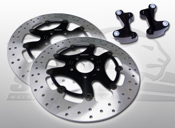 This kit includes two anodised black billet caliper adapters, to reposition the original brake calipers, and two of the latest generation 320mm front brake discs.