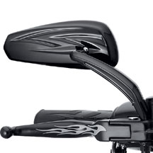 Billet-style mirror features a tapered shape that provides excellent rearward visibility. The deeply grooved stem and the swept-back design hug the contour of the handlebar, and the tribal flames add an element of ancient mystery. The distinctive cast-in recesses of the tribal layout highlight the details in the metal work, and add depth and dimension to the gloss black finish. Design complements the available Tribal Collection hand grips, foot pegs and foot controls.