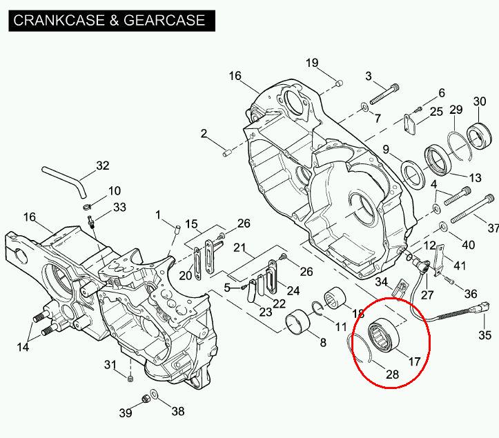 and enhanced durability in high-torque applications. The bearing is installed in the left side of the crank case, and supports the output shaft to the primary drive system.