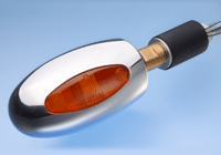 These handlebar mounted indicatorsare the ultimate form-follows-functiondesign as they help to reducehandlebar vibrations. They fit allhandlebars with internal diameters from11.5 mm thru 24 mm and feature TÜVand EU approved lenses and a 12Volt/21 Watt halogen bulb. Available inchrome plated or black powder coatedsteel, satin or polished finish StainlessSteel, as well as black anodized,machined or polished aluminum. Due totheir reduced weight, the aluminumversion gives less vibration damping.These handlebar vibration damper/indicators are sold each. Order twopieces to complete one motorcycle.Available with dual amber or whitelenses, one on the front and one on therear, or a single white lens on the front. LET OP, bestel ook artikelnummer HE4AZ001.879-011, dit voorkomt het snel knipperen. Deze vervangt je orginele knipperlicht relais.