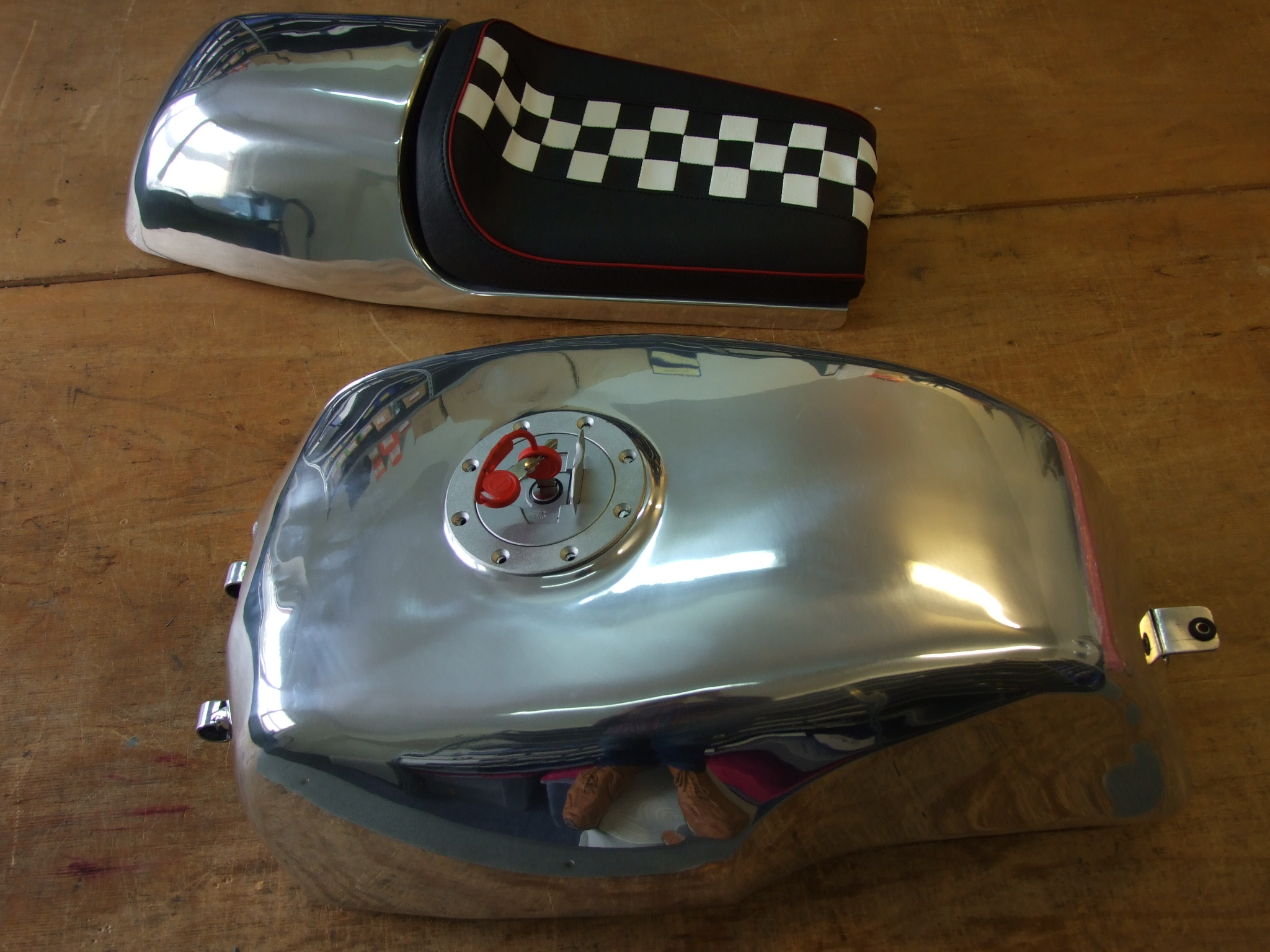 Also in this kit you find the mounting hardware for the aluminium tank, the seat and the air box, LED taillight, LED license plate light, license plate holder, and a decal set. The tank uses the original fuel line with connector. An you need to mount the stock fuelpump back in the new tank.