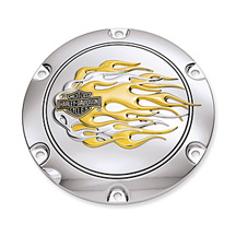 Sportster Gold & Chrome Flames Collection Derby Cover. Fits 2004-later XL and XR models. Includes chrome-plated stainless steel mounting hardware.