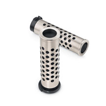 Make your own noise. Unique electroless nickel plating provides this collection with a warm, burnished finish that looks like you've been twisting this throttle for years. The warm look of the nickel will complement both bright and satin paint colors, and looks right when paired with the black Original Equipment hand controls. The precision drilled surfaces bite against the palm of your glove and boot sole for positive grip, and provide the gun barrel look. Hand Grips are a comfortable 1.4" diameter for acompact custom look, and the "glueless" design allows easy removal for service without damage.